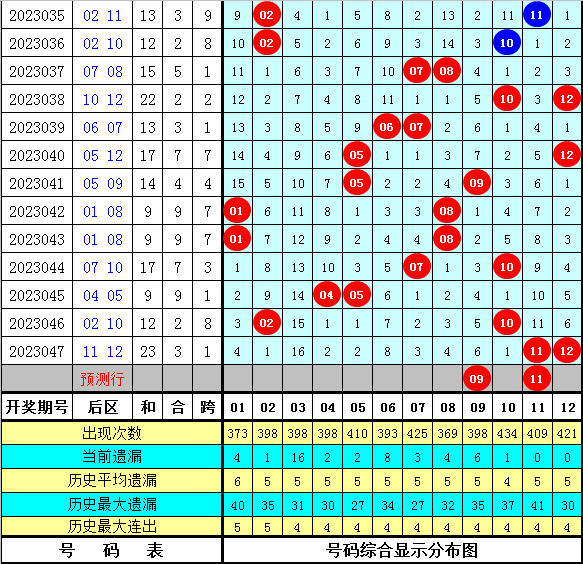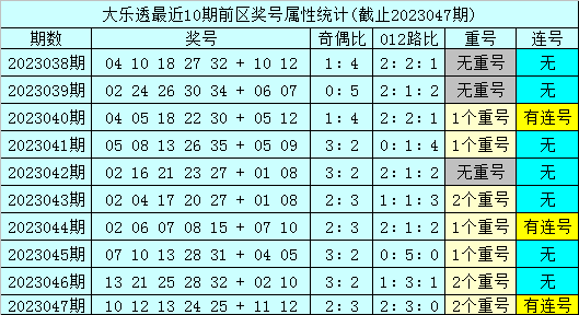 上期回顾:体彩大乐透第2023047期奖号为:10 12 13 24 25 + 11 12,其中前区号码012路比为2:3:0,奇偶比为2:3,包含2个重复号码:13、25。后区号码和值为23,跨度为1。
