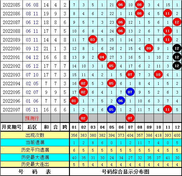 后区分析:在第098期历史同期开奖中,后区和值分别开出12、12、8、11、18、21、13、15、9、21、12、7、14、16,本期后区注意和值走小,和值参考9。