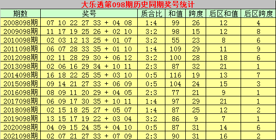大乐透历史同期第2022098期奖号分析: