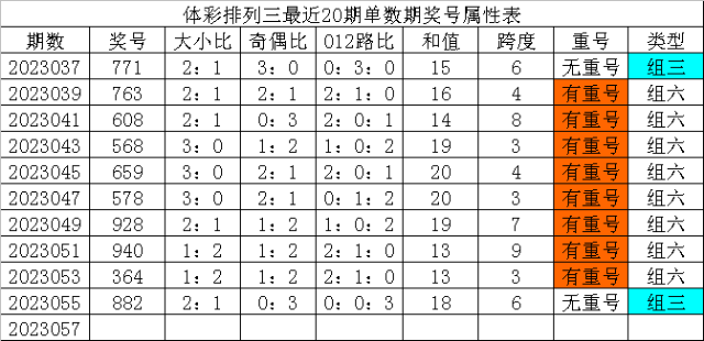 体彩排列三最近20期单数期奖号分别为:771、763、608、568、659、578、928、940、364、882,各期奖号详细属性下表: