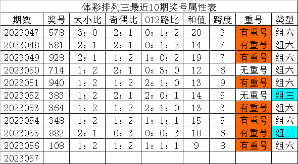 体彩排列三最近10期分别开出奖号:578、581、928、714、940、383、364、348、882、108,各奖号属性详见下表: