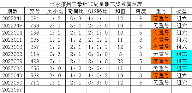 体彩排列三最近10周星期三奖号分别为:084、739、136、083、237、114、499、656、568、714,各奖号属性详见下表: