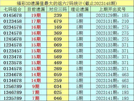 1。截止第23148期,七码组六遗漏最大的是:0145678,当前遗漏19期。