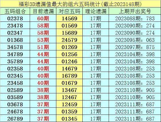 3。福彩3D第23148期10个遗漏最大的五码组六开出0个。