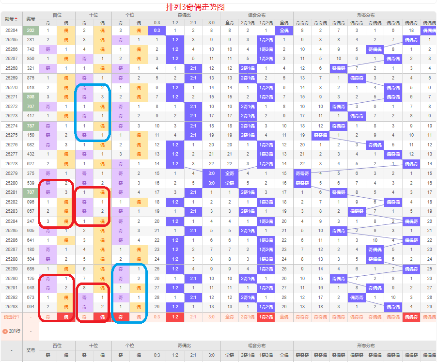 上一期的奇偶比为1:2,两偶的号码组合,从近五期的奇偶数出现情况看,奇数出7次,偶数出现8次,奇数偶数号码出现较平均,本期要侧重两偶的号码组合,侧重偶偶奇或偶奇奇的号码组合,根据奇偶组合形态可做五码定位02468/02468/13579或02468/13579/13579