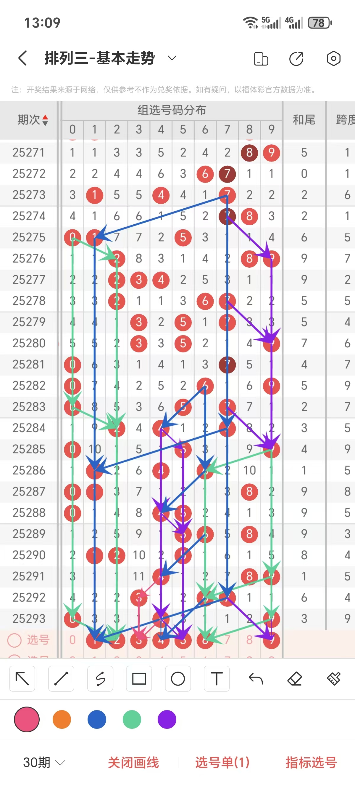 通常情况下在五期之内重复一个跨度的概率较高,近五期重复了4的跨度,近五期跨度为3/4/5/4/9,近期01路的跨度较热,本期要侧重3/4跨为主的号码组合。选择好跨度就可以从跨度方面选择相应的双胆码组合,双胆码的选取要根据近期和历史的走势进一步的分析选取。
