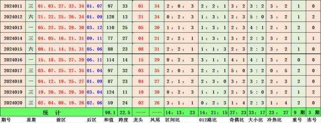 冷热分析:上期开出1个冷码,冷热比1:4,近十期冷热比为23:27,热号码出号较多,根据图表分析,本期预测冷码多出,推荐冷热比3:2。