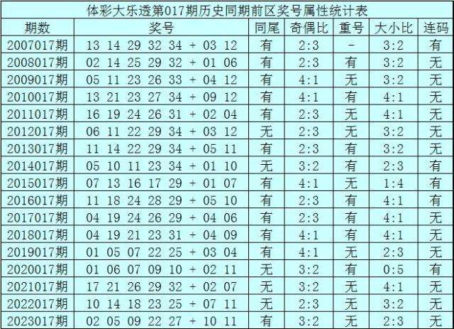 体彩大乐透第017期历史同期开出17次奖号,其统计详见下表: