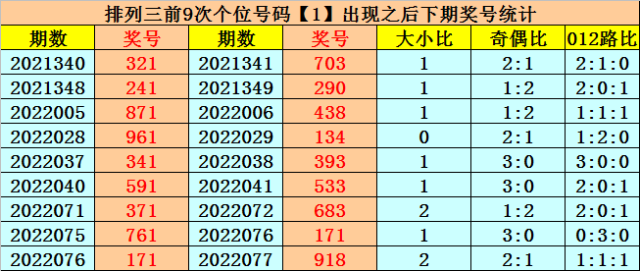 个位号码:上期奖号为小号、奇数、1路号码:1,历史上个位号码1共开出605期,前一次出现在第2022076期,上期遗漏44期再出。