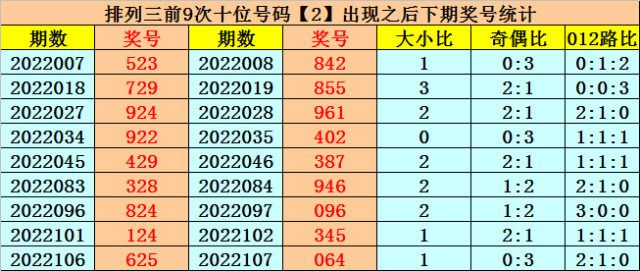 在十位前9次出现号码2后,其下期奖号分别开出:4-5-6-0-8-4-9-4-6,其中奖号个数012路比是4:3:2,奇偶比是2:7,大小比是5:4。
