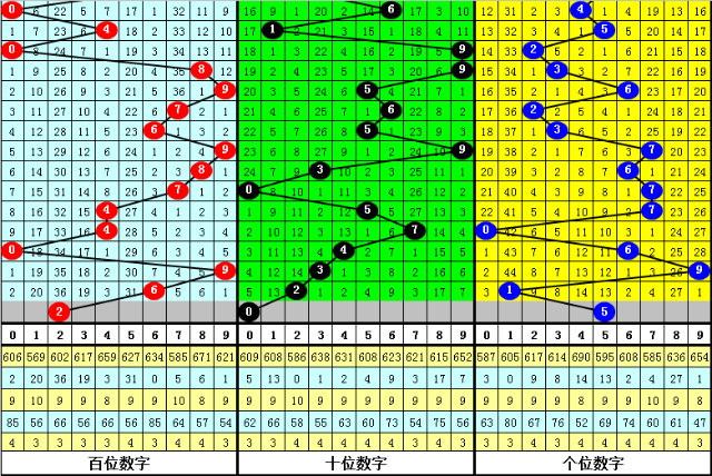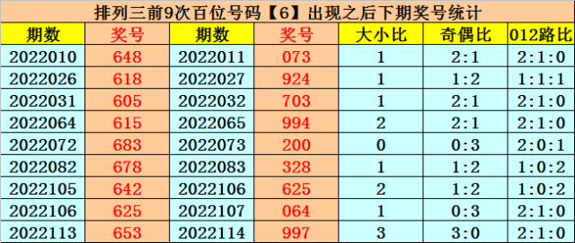 在百位前9次出现号码6之后,下期百位分别开出奖号:0-9-7-9-2-3-6-0-9,其中开出号码个数奇偶比是5:4,大小比是5:4,012路比是7:1:1。