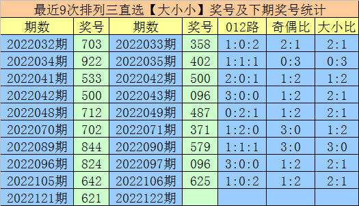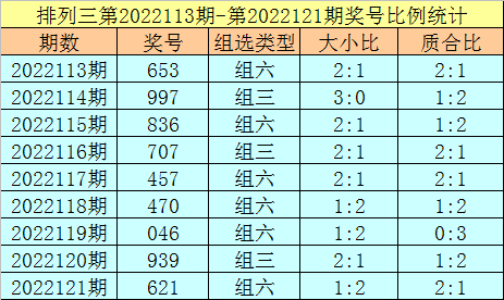 上期回顾:排列三2022121期奖号为621,号码类型:组六,奇偶比1:2,大小比1:2,012路比1:1:1。