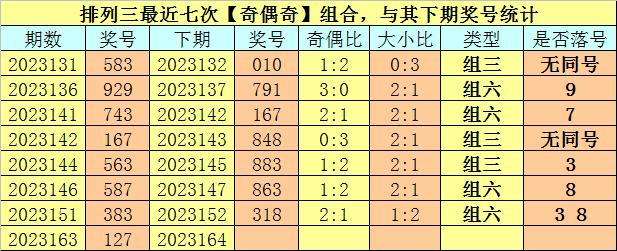 开奖回顾:排列三第2023163期开奖号码为:127。奖号类型为:组六,大小类型为:小小大,奇偶类型为:奇偶奇,无重号。