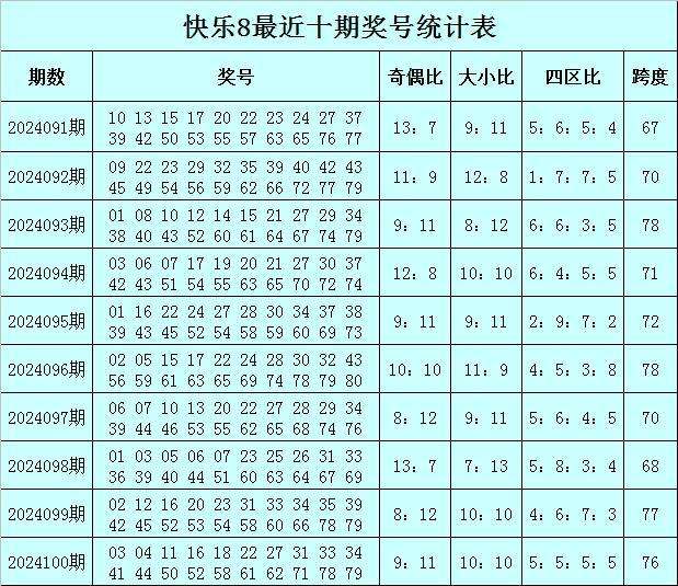 福彩快乐8第2024100期开奖回顾:03 04 11 16 18 22 27 31 33 34 41 44 50 52 58 61 62 71 78 79,其中奖号奇偶比开出9:11,大小比开出10:10,包含5个小奇号码:03 11 27 31 33,5个小偶号码:04 16 18 22 34,4个大奇号码:41 61 71 79,6个大偶号码:44 50 52 58 62 78。