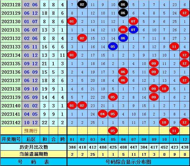 后区分析:上期后区奖号为10和12,最近5期后区和值分别为19、14、3、9、22,后区跨度分布范围在1-4,本期后区注意两码05、11。