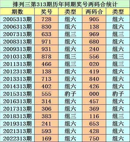排列三从2004年开奖至今已开出6733期奖号了,其中第313期历史同期奖号出现17次,历年第313期分别开出号码:728、830、633、971、931、878、466、138、713、402、555、314、306、383、241、593、169。