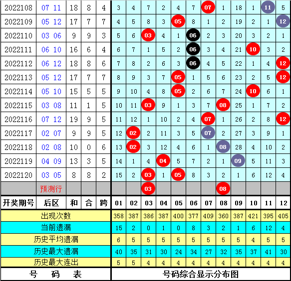 后区上期开出奖号:03+05,前6次后区奖号03+05出现之后,其下期分别开出号码:01+12、01+06、04+05、07+10、03+07、03+11,本期后区注意五码01 03 05 08,单挑两码03 08。