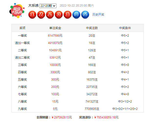 上期开奖:大乐透第2022120期开奖号码为:11 22 26 30 33 +03、05,各位号码遗漏值分别为:5 3 1 17 6 + 4 5。