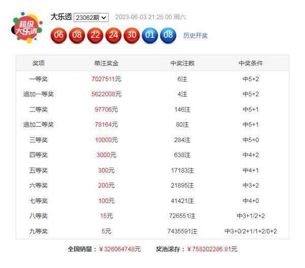 上期开奖:体彩大乐透第23062期开奖号码:06 08 22 24 30+01 08,前区和值:90,跨度:24,奇偶比:0:5,大小比:3:2,五区比:1:1:0:2:1,没有出现重号。