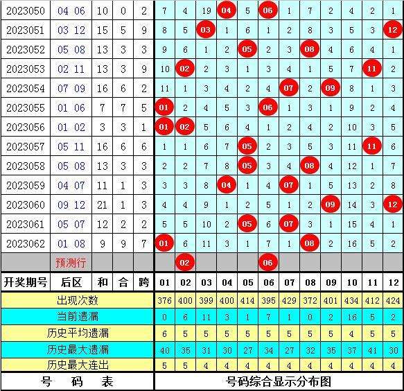 后区分析:后区上期开出号码01+08,和值为9,跨度为7。最近10区后一区(01-06)开出10个号码,断区2次,后二区(07-12)开出10个号码,断区2次,本期后一区注意号码:01、02、04、06;后二区注意号码:10、11。