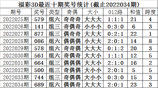 开奖回顾:福彩3D第2022034期奖号为689,奖号形态为:组六、大大大、2:0:1、偶偶奇。