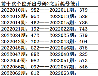 四、个位分析:上期开出号码2,前10次号码2出现之后下期同位号码为:9863945536,其中号码大小比为7:3,小号走势较冷;奇偶比为6:4,基本持平;012路比为6:1:3,2路号码走温。本期参考号码:2。
