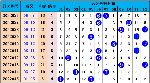 和值分析:上期后区和值为6,比前期下降4个点位,预测本期和值走势上升,推荐和值区间15--20