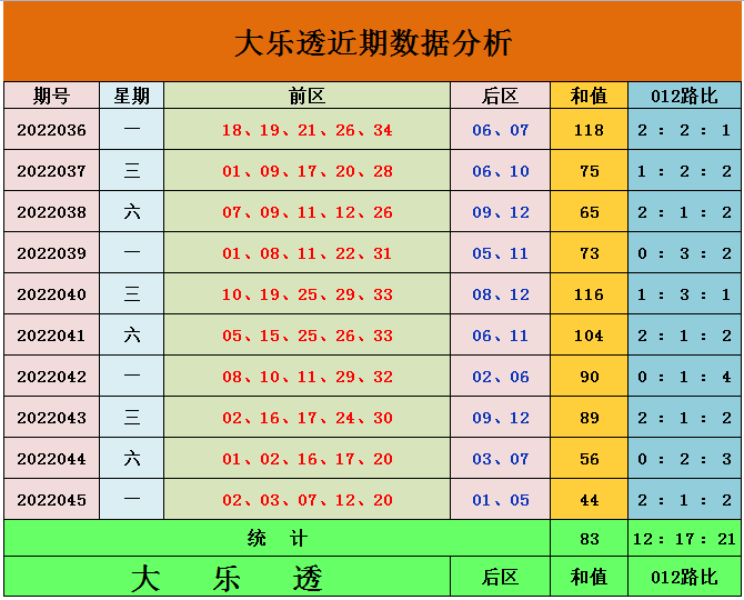 上期回顾:大乐透第2022045期奖号:前区02、03、07、12、20,后区01、05。前区奖号和值为44,012路比为2:1:2,后区开出小小组合01、05