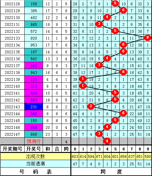 福彩3D第2022147期最大跨度开出3,跨度近期分布比较密集,主要分布在2-6区段,本期预计最大跨度在1-5区段出现,最大跨度关注12345,重点关注跨度4。