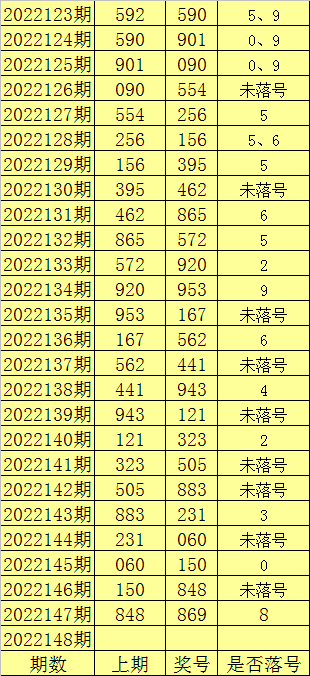 福彩3D第2022147奖号869,重号落号。在最近100期(第2022048期-2022147期)中,重号落号66期;最近20期重号落号概率为60%;最近10期重号落号概率为50%。本期预计重号可能落号。