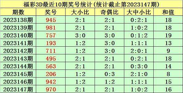 开奖回顾:福彩3D第2023147期奖号为:970。奖号类型为组六,和值为16,奇偶比为2:1,跨度为9,012路比为2:1:0,大小比为2:1。