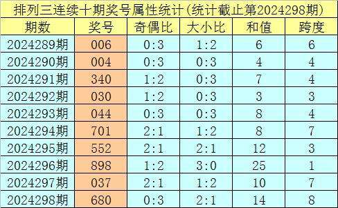 上期回顾:排列三第2024298期奖号:680。类型:组六,奇偶形态:偶偶偶,大小形态:大大小,和值:14,跨度:8。