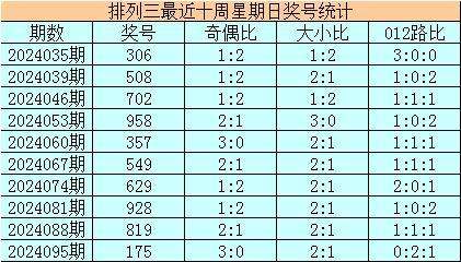 排列三十周星期日分别开出奖号:175、819、928、629、549、357、958、702、508、306,其中号码奇偶比为17:13,奇偶号码基本持平;号码大小比为19:11,小号走势较冷;号码012路比为12:6:12,1路号码走冷。