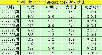 开奖回顾:排列三第2024101期奖号为:030,其奇偶比为1:2,大小比为0:3,奖号012路比为3:0:0。