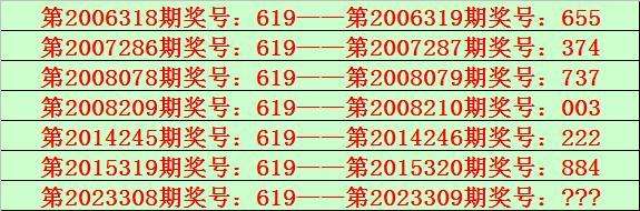 排列三第2023308期开出奖号619,该号码直选类型历史上出现了7次,前6次开出之后期下期奖号为:655、374、737、003、222、884,见下表: