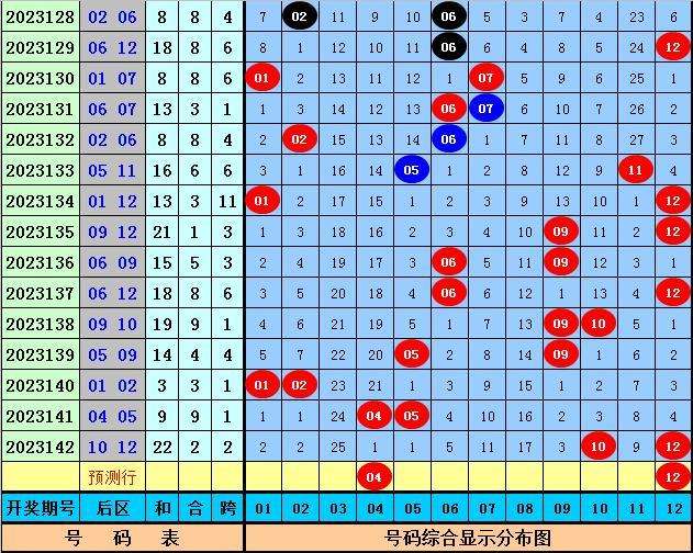 后区奖号分析:上期后区开出奖号10+12,奖号和值为22,跨度为2,本期预计后区和值转小,关注两码04 12。