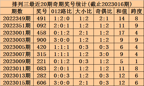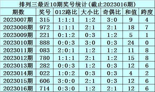 上期回顾:排列三2023016期奖号为714,奇偶比为2:1,大小比为1:2,跨度为12。