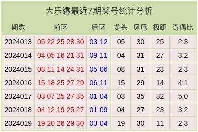 上期大乐透的开奖号码中,首尾组合为19+30,极距为11,奇偶比为2:3。