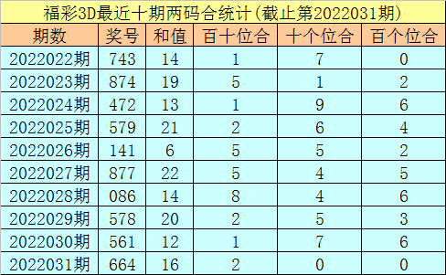 开奖回顾:福彩3D第2022031期:奖号为664,奖号质合比为0:3,大小比为2:1,跨度为2,类型为组三。