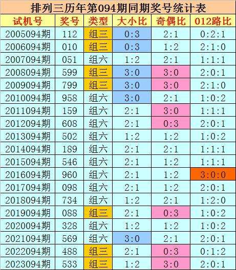 奇偶分析:历史上排列三第094期同期奖号中,奇偶比0:3出现3期,奇偶比3:0出现4期,奇偶比1:2、2:1出现6期,奇偶奖号总比例开出30:27,奇数号码相对活跃,今年第094期预计奇数号码再次走热,关注奇偶比为2:1。