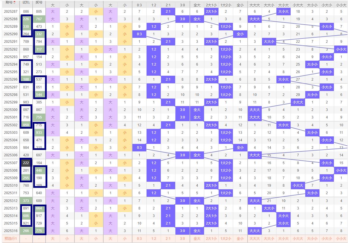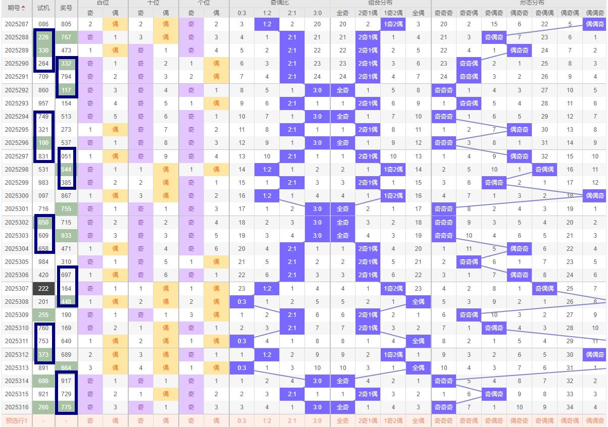 大小走向分析 根据316期开奖号码775,可以看到大小形态为大大大。在最近的走势中,大小号码开出比例基本持平。因此,对于317期,可以预判大小号码继续维持均衡状态,关注大小比1:2的组合。近十期大小比为18:12大数占据优势。防全小