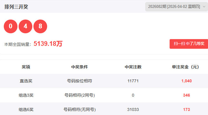 排列3上期(2026082期)开奖号码详情