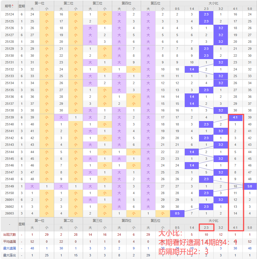 上期大小比:0:5,近10期大小比出现情况:1:4、3:2、1:4、3:2、2:3、5:0、2:3、3:2、2:3、0:5,最近10期出现3期3:2,出现3期2:3,出现0期4:1,出现2期1:4,出现1期5:0,出现1期0:5,根据近10期规律本期看好遗漏14期的4:1,防隔期开出2:3,综上所述推荐大小比推荐:2:3,重点关注:4:1。