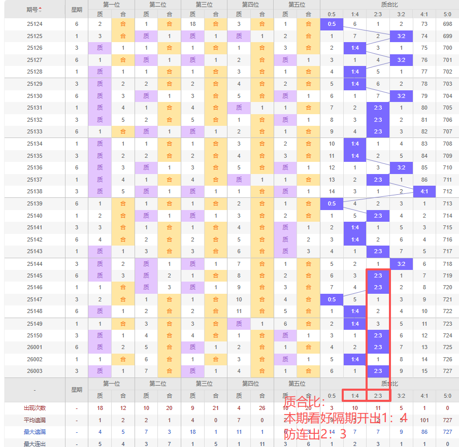 上期质合比:2:3,近10期质合比出现情况:3:2、2:3、2:3、0:5、1:4、1:4、2:3、2:3、1:4、2:3,最近10期出现1期3:2,出现5期2:3,出现0期4:1,出现3期1:4,出现0期5:0,出现1期0:5,根据近10期规律本期看好隔期开出1:4,防连出2:3,综上所述推荐质合比推荐:2:3,重点关注:1:4。