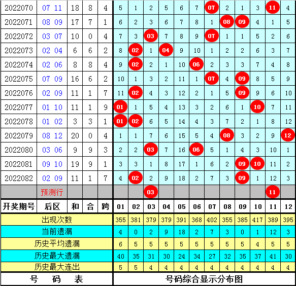 后区分析:在第083期历史同期开奖中,后区奖号全偶组合开出3次,一奇一偶组合开出8次,全奇组合开出4次,本期预计后区开出全奇组合,参考号码01、03、05、11。