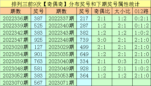 排列三第2023070期奖号为567,直选奇偶分布为:奇偶奇,该奇偶分布历史上共出现了794次,前100期出现12次。