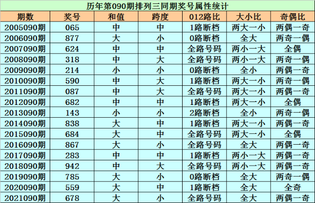 历史上第2022090期排列三已开出17期奖号了,历年同期奖号分别为:065、877、624、318、214、590、087、682、143、838、684、867、283、942、785、559、678,详细统计见下表:
