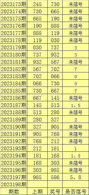 福彩3D第2023197奖号586,重号落号。在最近100期(第2023098期-2023197期)中,重号落号61期;最近20期重号落号概率为55%;最近10期重号落号概率为40%。本期预计重号可能落号。