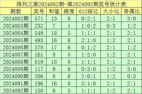 开奖回顾:排列三第2024092期奖号开出:150,组选类型:组六,大小比为1:2,奇偶比为2:1,和值为6,跨度为5。