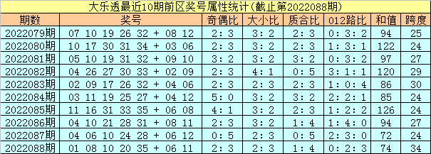 开奖回顾:体彩大乐透第22088期开出奖号为:01 08 10 20 35+06 11,前区大小比为2:3,012路比为0:2:3,质合比为1:4,奇偶比为2:3,后区大小比为1:1,012路比为1:0:1,质合比为1:1,奇偶比为1:1。